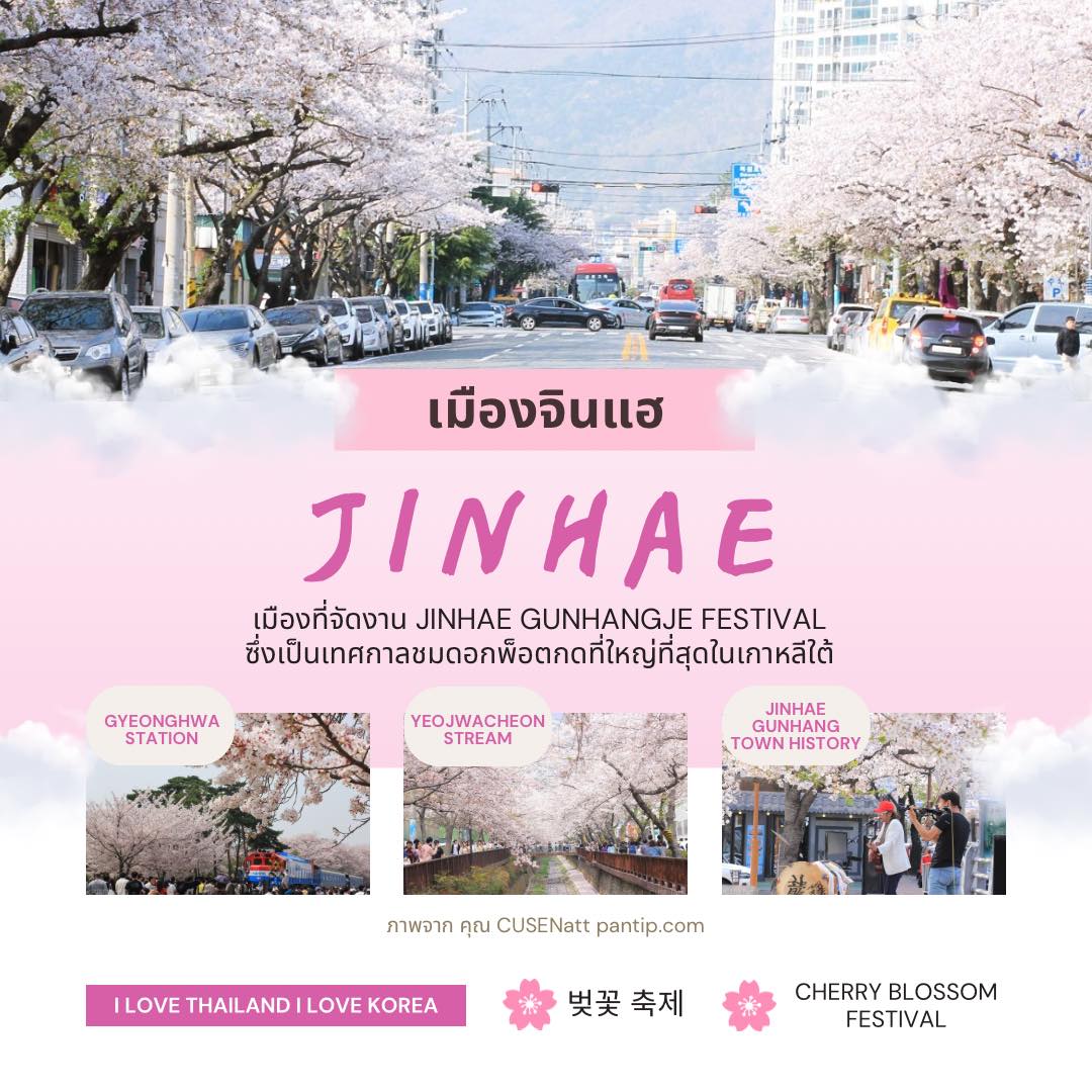 เมืองจินแฮ (Jinhae) การเดินทาง: รถไฟจากสถานีโซล โดยขึ้นรถไฟ KTX หรือ ITX ไปยังสถานีChangwon จากนั้นต่อรถไฟท้องถิ่น (หรือแท็กซี่) ไปสถานี Jinhae