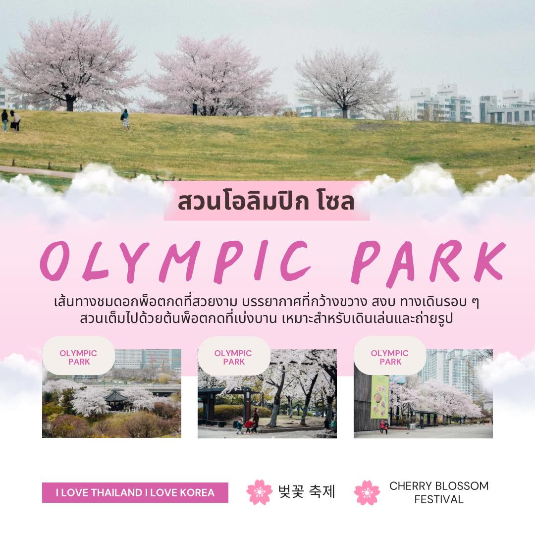 สวนโอลิมปิค โซล (Olympic Park) การเดินทาง: รถไฟใต้ดินสาย 5 ลงสถานี Olympic Park ทางออก 3 หรือ รถไฟใต้ดินสาย 8 ลงสถานี Mongchontoseong ออกทางออก 1 (เดินใกล้ที่สุด)