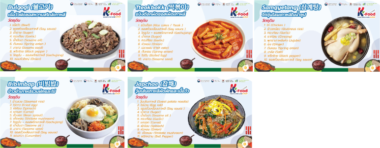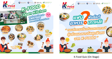 2천여 명의 방문객을 대상으로 10가지 이상의 한식과 전통 음료를 무료로 맛볼 수 있고, 태국 식재료를 활용한 한국 요리 콜라보 시연도 실시될 예정이다. 또 태국 인기 인플루언서와 연예인들이 진행하는 퀴즈 게임, 럭키 드로, K-FOOD를 배경으로 한 포토 부스 등 다양한 즐길 거리가 마련된다.