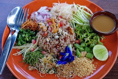 보통 솥 바닥에 남은 밥이나 하룻밤 묵힌 밥을 사용하며, 전통적으로는 ‘사오하이’ 쌀이나 오래된 쟈스민쌀을 적은 물로 지어 사용합니다. 옛날에는 새우젓을 바나나 잎에 싸서 불에 구워 향을 낸 뒤 밥과 섞었습니다. 새우젓을 프라이팬에 볶아 향을 낸 후 밥과 함께 비벼 완성하며, 곁들임으로 바삭하게 튀긴 건새우, 단돼지고기, 중국 소시지, 채 썬 달걀지단, 샬롯 슬라이스, 고추 슬라이스, 생망고, 고수, 오이를 곁들입니다.