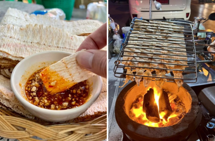길거리에서 멀리서부터 구수한 냄새가 퍼져오면, 아마도 그건 바로 태국의 전통 간식 쁘라믹볻(ปลาหมึกบด), 즉 “구운 말린 오징어”일 거예요!