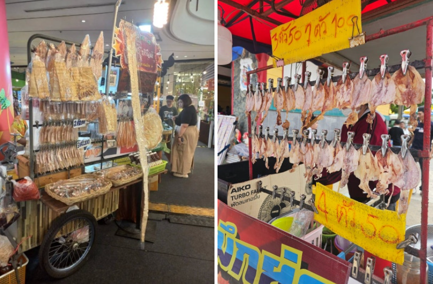 태국 사람들은 “위쪽에 걸린 오징어일수록 맛있고 비싸다”고 말하곤 하죠. 위쪽 오징어는 살이 두껍고 향이 더 진하니까요.