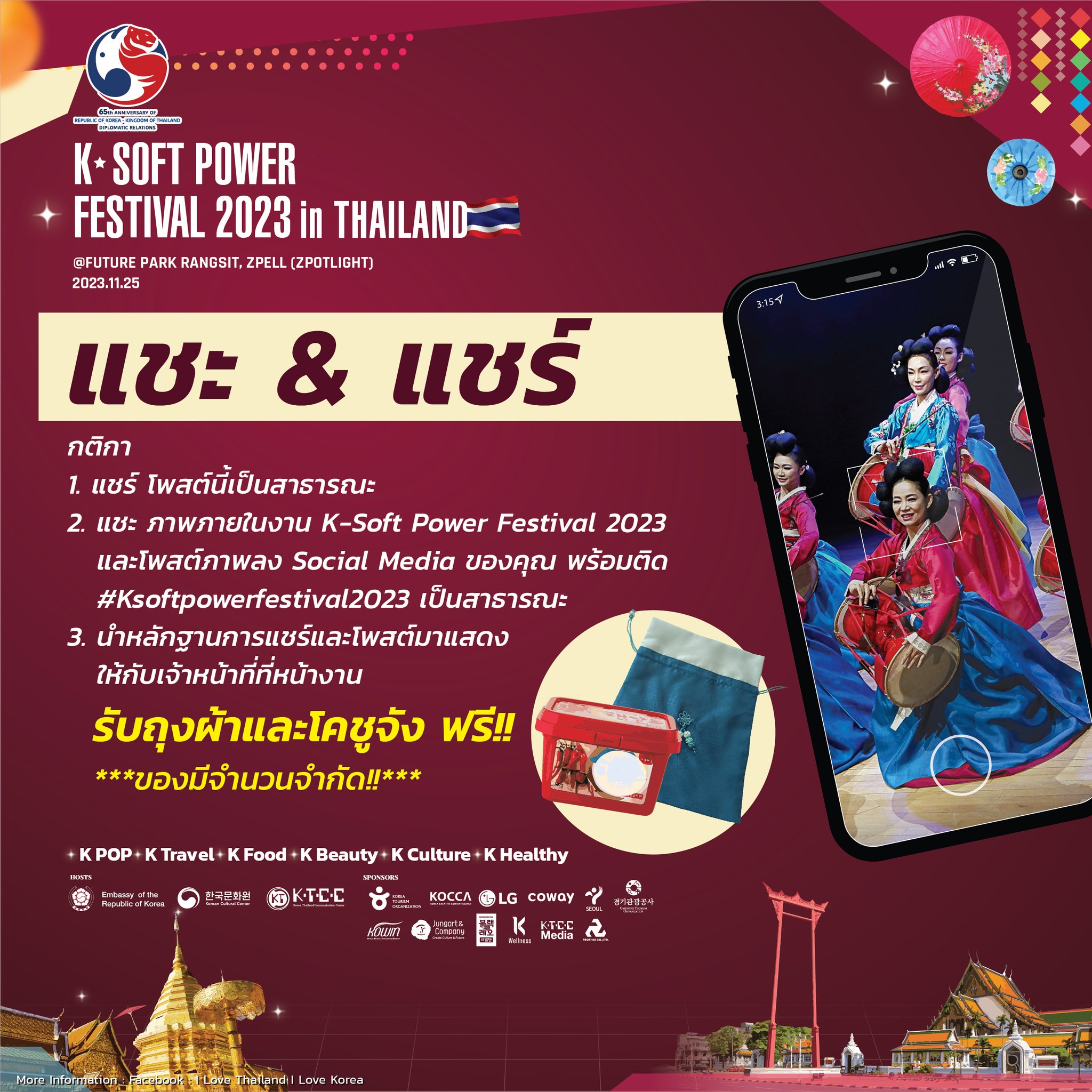 ทุกคนสามารถเข้าร่วมงาน K-Soft Power Festival ได้ฟรีและสัมผัสกับข้อมูลการเดินทางของเกาหลีและ K-Food รวมถึงเข้าร่วมกิจกรรมต่างๆทั้งออนไลน์และออฟไลน์