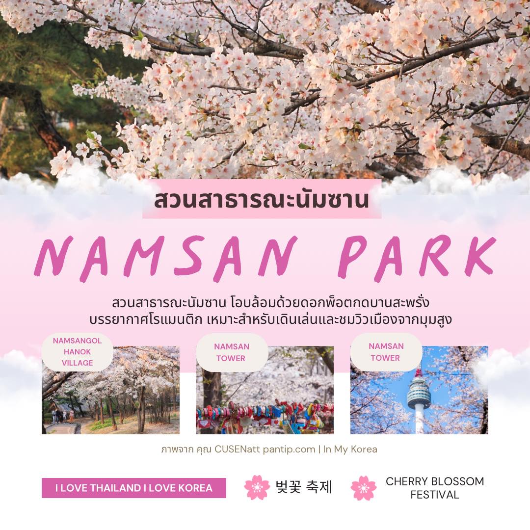 สวนสาธารณะนัมซาน (Namsan Park) การเดินทาง: รถไฟใต้ดินสาย 4 ลงสถานี Myeongdong ทางออก 3 หรือสถานี Chungmuro ทางออก 2