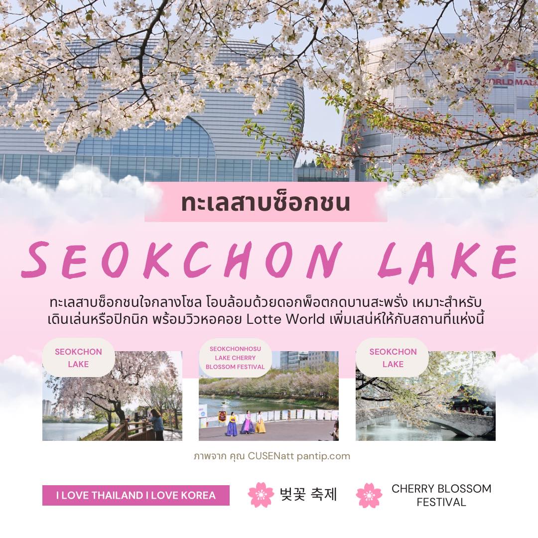 ทะเลสาบซ็อกชน (Seokchon Lake) การเดินทาง: รถไฟใต้ดินสาย 2 หรือ สาย 8 ลงสถานี Jamsil ทางออก 2 หรือ 3 แล้วเดินอีกประมาณ 5 นาที