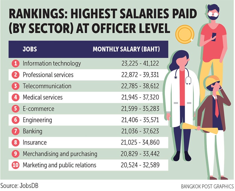 ☞ JobsDB 코로나 영향으로 태국 최고 임금 직군은 IT, 전문 서비스, 통신 관련 업종. 매니저급은 보험 분야(월 55,762밧-90,716밧), 정보통신(54,435밧-93,324)밧 순.