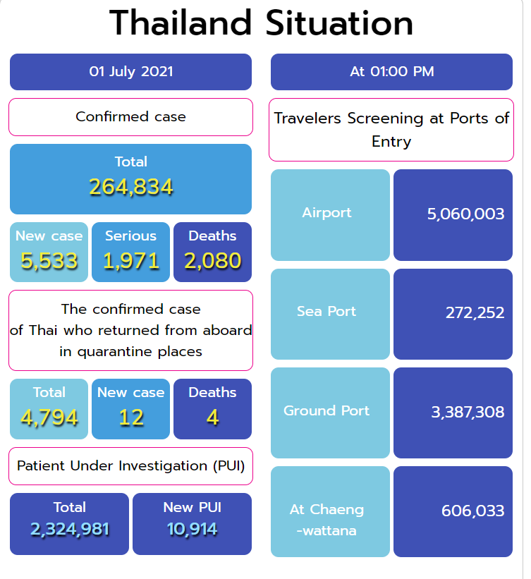 구체적 통계는 안나왔지만 7월 첫날 태국의 신규 확진자수는 6,087명으로 2일 오전 발표됐다. 역대 최대인 61명이 하루동안 사망했다.