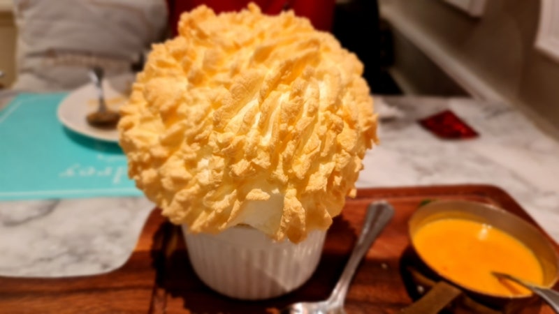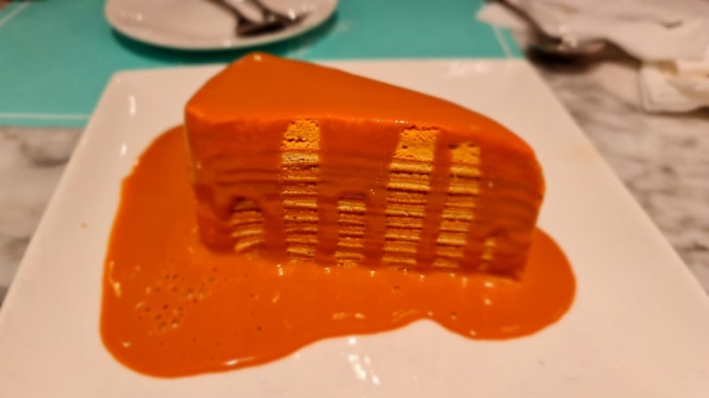 이곳의 시그니처 디저트는 타이티 끄라페 케익인듯 하다. 스폰지 케이크 보다는 질감이 있고 층층이 무늬를 넣은 정성을 보여주고 있다. 밀로 시즐링 로티도 추천되는 메뉴다. 음료 및 디저트에 5가지 정도요리면 1500-1600밧 나오고 부가세 7%와 봉사료 10% 따로 붙는다.