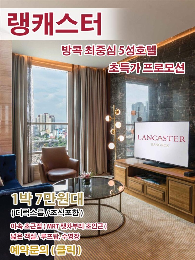 https://lancasterbangkok.com 을 통해 호텔을 360도로 둘러보고 예약도 직접 할 수 있는데 에이전시 가격이 있는 해피타이(www.happythai.co.kr 02-701-7441) 를 통하면 더 저렴하고, 무엇보다 정확한 예약이 가능하며 피드백도 받을 수 있다.