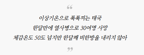 태국도 다르지 않아 일부 지방의 한낮 최고온도가 섭씨 45도에 이르고, 수도 방콕의 체감온도는 연일 50도를 넘어서고 있다.