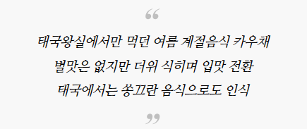 태국 한 기업 임원을 방콕 한식당에서 만나 냉면을 먹으며 그런 설명을 했는데 태국임원은 태국에도 더위에 먹는 계절 음식이 있다고 응수하며 다음날 점심시간에 맞춰 카우채 3세트를 보내줬다.