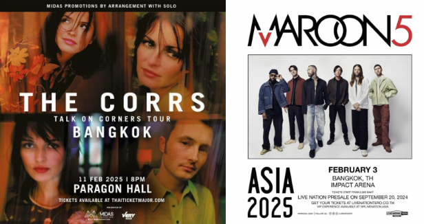 2월 9일에는 한국 인디록밴드 웨이브 투 어스가, 2월 11일에는 아일랜드 출신의 1형제, 3자매로 구성된 포크록 그룹 코어즈(THE CORRS)가 방콕에서 가장 인파가 많은 파라곤홀 무대에 오릅니다.