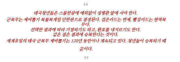 몇몇 청년에게 자진입대할 생각이 없느냐고 물었더니 모두 “검은색 카드를 뽑아 면제될 것”이라고 호기롭게 말했다.