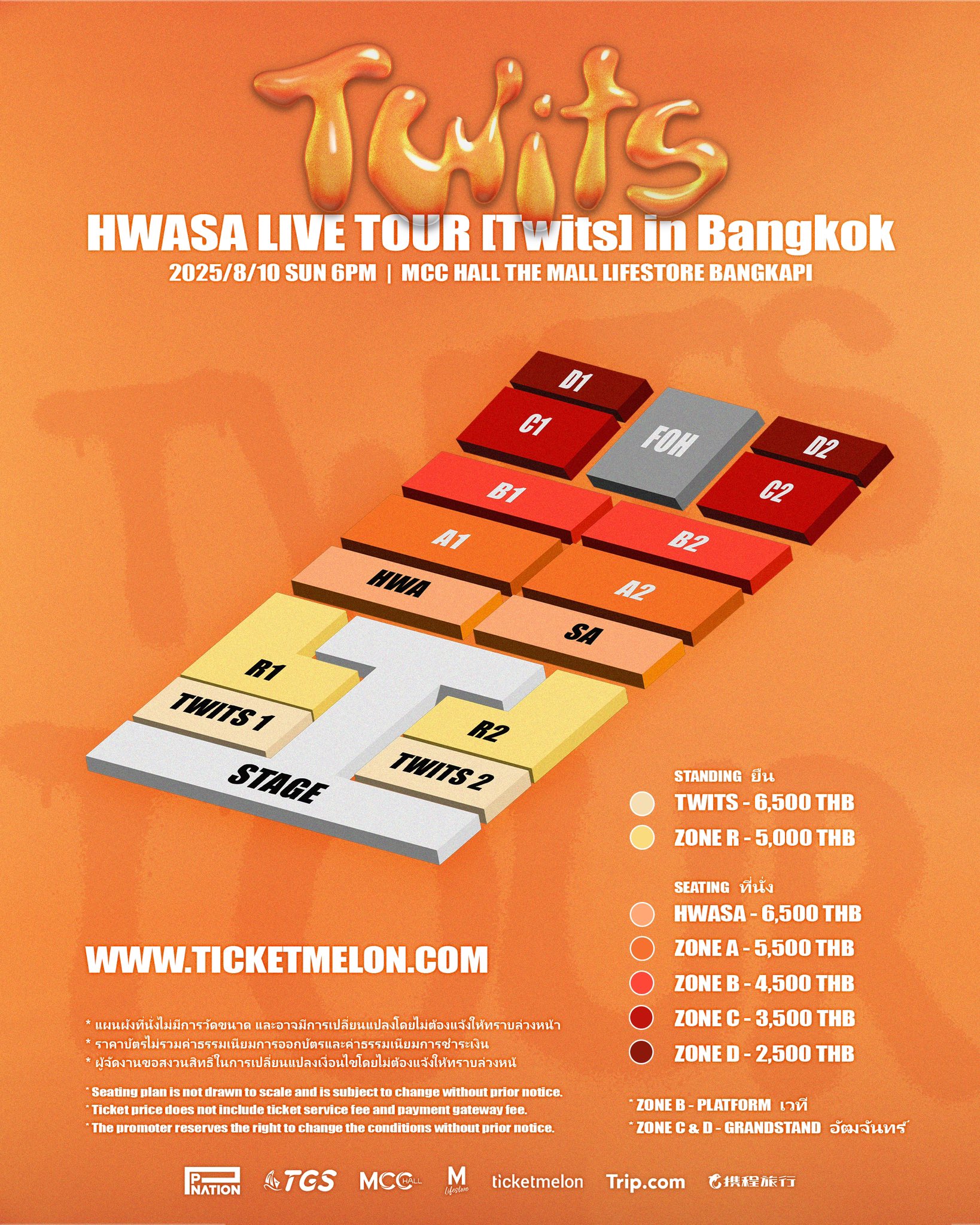 Ticket Price : 6,500 THB/ 5,500 THB/ 5,000 THB/ 4,500 THB/ 3,500 THB/ 2,500 THB