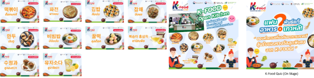 2천여 명의 방문객을 대상으로 10가지 이상의 한식과 전통 음료를 무료로 맛볼 수 있고, 태국 식재료를 활용한 한국 요리 콜라보 시연도 실시될 예정이다. 또 태국 인기 인플루언서와 연예인들이 진행하는 퀴즈 게임, 럭키 드로, K-FOOD를 배경으로 한 포토 부스 등 다양한 즐길 거리가 마련된다.