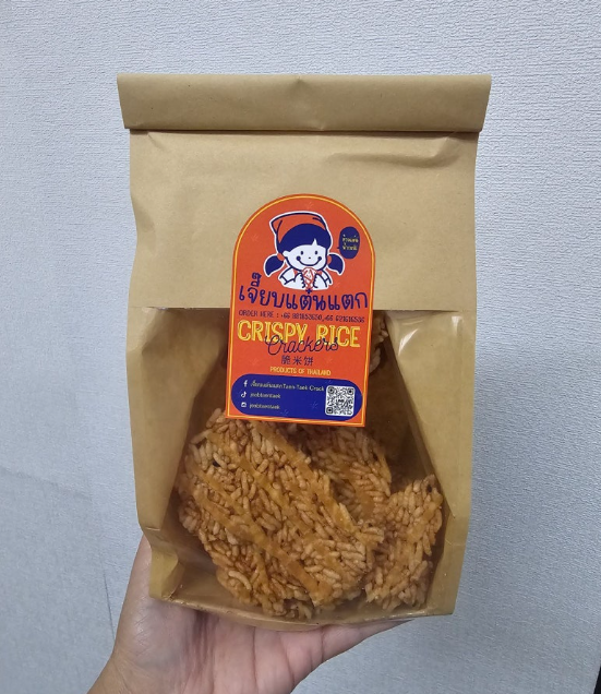 แพ็กนี้เป็นของ “เจียบแต๋นแตก” ที่มาในถุงกระดาษสีน้ำตาล ดูเรียบง่ายแต่มีสไตล์ ด้านในเต็มไปด้วยแผ่นข้าวแต๋นขนาดใหญ่ กรอบฟู เคี้ยวเพลินสุด ๆ ราดด้วยน้ำเชื่อมสูตรพิเศษที่เคี่ยวจากกะทิ น้ำตาล และเกลือบาง ๆ ให้รสหวานมันพอดี ไม่หนักจนเลี่ยน