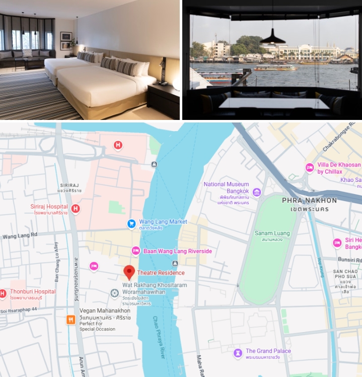 Theatre Residence(시어터 레지던스)는 차오프라야강 변, 왓 라강 골목(Soi Wat Rakang) 인근에 위치한 4성급 호텔로, 방콕 톤부리 지역의 고즈넉한 분위기와 오래된 지역 특유의 매력을 느낄 수 있는 곳이다.