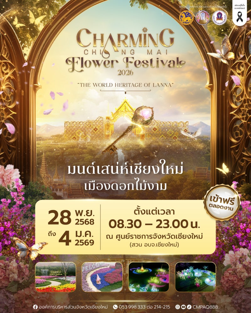 치앙마이의 연례 꽃 축제 ‘Charming Chiang Mai Flowers Festival 2026’이 11월 28일부터 내년 1월 4일까지 열립니다. ‘The World Heritage of Lanna – 세계문화유산 도시, 란나의 매력’이라는 콘셉트로 진행되며, 넓은 공간에서 꽃 전시와 란나 문화 요소를 선보이며, 다양한 활동에도 참여할 수 있습니다.