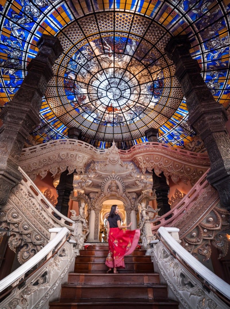 코끼리를 받치는 원형 건물인 ‘인간 세계 층’은 동서양 예술을 혼합해 장식되어 있으며, 스테인드글라스 천장은 세계지도와 사대 원소, 별자리 상징 색으로 구성되어 있어 천체가 인간 삶에 미치는 영향을 표현한다.
