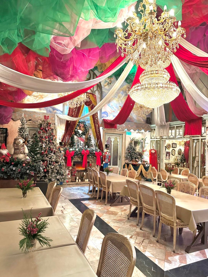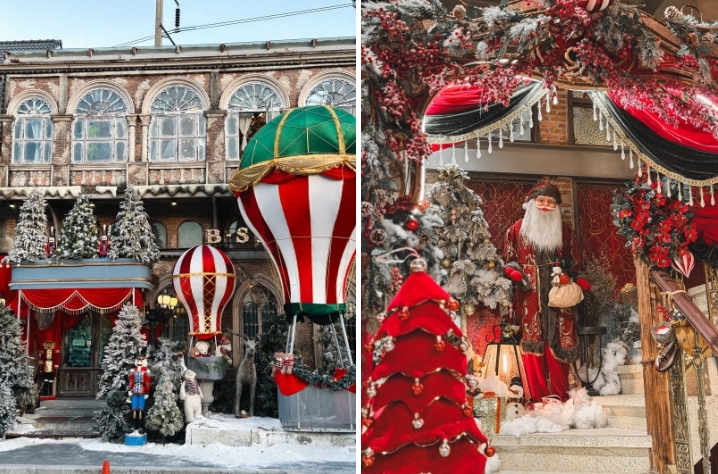 올해는 따뜻한 톤의 유럽풍 콘셉트로 꾸며져 차분하면서도 세련된 연말 분위기를 느낄 수 있습니다. 실내와 야외 공간 모두 균형 있게 연출되어 휴식과 사진 촬영에 적합합니다.