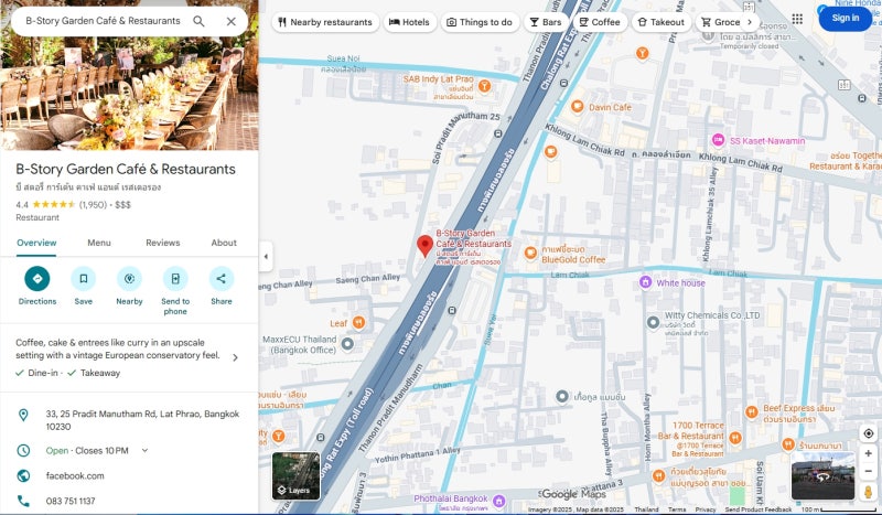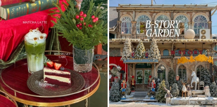 B Story Garden Cafe는 방콕 람인트라 고속도로 인근에 위치한 유명 카페로, 매년 크리스마스 시즌마다 특별한 테마 장식을 선보이는 곳입니다.