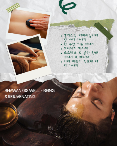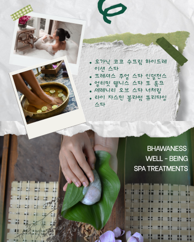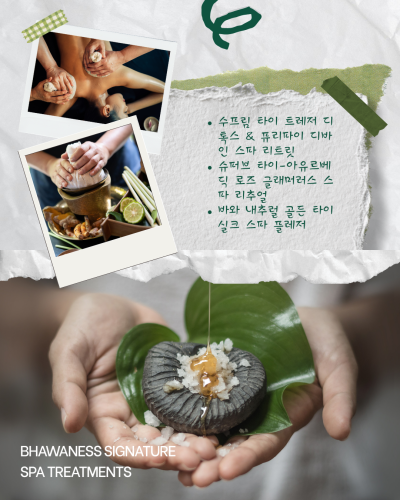 BHAWA 내부에는 발마사지, HOT JEWEL STONE MASSAGE, ORGANIC COCO SUPREME-HYDRATION SPA, THAI JASMINE BLOSSOM PURIFYING SPA, THE THAI-AYURVEDIC ROSES GLAMOROUS SPA RITUAL 등 다양한 스파 패키지가 준비되어 있다. 사전에 원하는 프로그램을 선택할 수 있다.