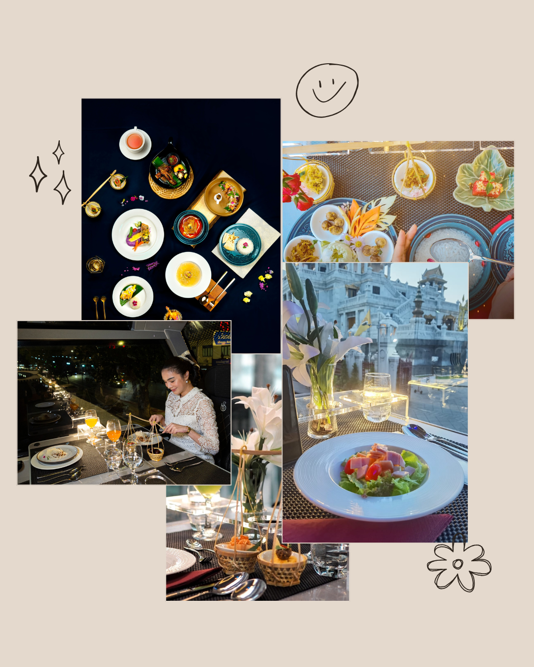 - Bangkok Sunset Symphony (18.00 – 19.00) : 저녁 코스로 Welcome drink, Appetizers, Soup, Main courses, Dessert로 구성되어 있다.