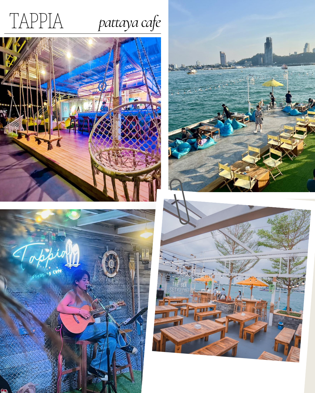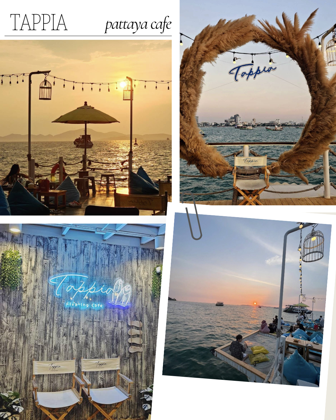 ‘탑피아 플로팅 카페 파타야(Tappia Floating Café Pattaya)’는 파타야 바다 한가운데에 위치한 수상 카페로, 루프탑에서 파타야 전경을 360도로 감상할 수 있다. 다양한 시설과 액티비티도 함께 이용할 수 있다.