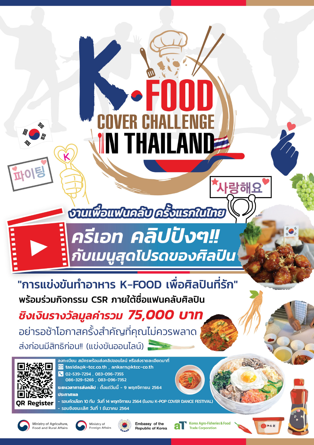 | กิจกรรมการทำอาหารเกาหลีกับกลุ่มแฟนคลับเกาหลีในประเทศไทย จัดโดยสถานเอกอัครราชฑูตสาธารณรัฐเกาหลีประจำประเทศไทย ร่วมกับ Ministry of Foreign Affairs ,Ministry of Agriculture Food and Rural Affairs และ Korea Agro-Fisheries and Food Corporation ร่วมจัดงาน “K-Food Cover Challenge in Thailand”