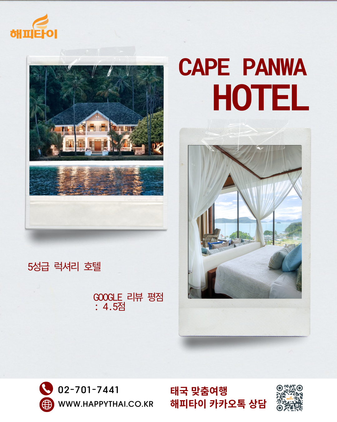 | Cape Panwa Hotel Phuket은 푸껫 남동쪽 끝자락에 위치한 판와 곶(Cape Panwa)에 자리한 5성급 럭셔리 호텔이다. 조용하고 프라이빗한 분위기가 특징이며, 길게 펼쳐진 전용 해변과 맑고 깨끗한 바다를 자랑한다. Cape & Kantary Hotels에서 운영하... |